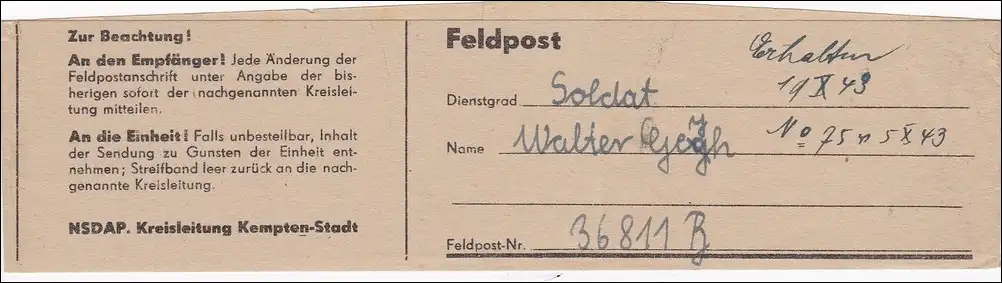 Kempten - Feldpost Streifband der Kreiszeitung an FPNr. 36 811 B, 1943