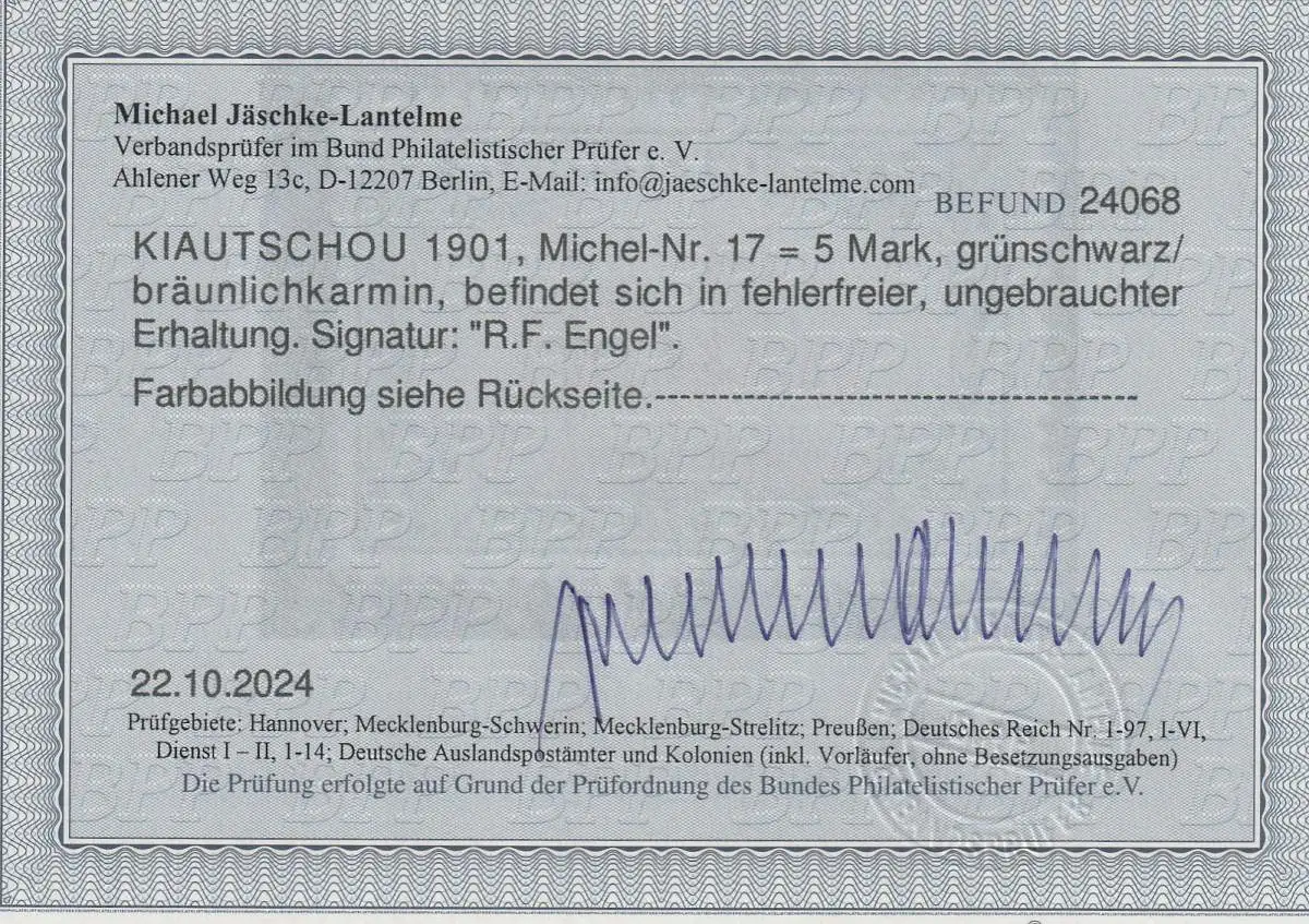 "Einwandfrei ungebraucht" - s. Abbildung und Befund Jäschke-Lantelme BPP. Michelwert 280,00 €.
