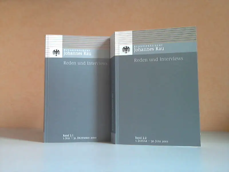 beide Bücher sind altersbedingt in einem gutem bis sehr gutem gebrauchten Zustand, BAND 2.1, 1. Juli - 31. Dezember 2000: Grußwort zur Festveranstaltung „300 Jahre Berliner Akademie der Wissenschaften" in Berlin 1. Juli 2000 - Offizieller Besuch des Generalsekretärs der Vereinten Nationen 2. - 4. Juli 2000 - Staatsbesuch des Präsidenten der Islamischen Republik Iran 10. - 12. Juli 2000 - Grußwort bei der Einweihung eines Denkmals für den persischen Dichter Hafis in Weimar 12. Juli 2000 - Rede auf dem ersten Kongress des Forums Bildung in Berlin 14. Juli 2000 - Rede beim Festakt zum Tag der deutschen Einheit in Dresden 3. Oktober 2000 - Ansprache bei der Ordensverleihung zum Tag der deutschen Einheit im Schloss Bellevue in Berlin 10. Oktober 2000 - Grußwort beim Deutsche-Welle-Forum „studieren in Deutschland" in Berlin 11. Oktober 2000 - Rede bei der Verleihung des Hans-Böckler-Preises 2000 in Potsdam 13. Oktober 2000 - Aufruf in Rundfunk und Fernsehen zur Woche der Welthungerhilfe 2000 13. Oktober 2000 - Grußwort bei der Wiedereröffnung des Museums für Ostasiatische Kunst in BerUn 13. Oktober 2000 - „Die Zukunft unserer Demokratie" Rede auf dem Jahresforum des Vereins „Gegen Vergessen - Für Demokratie e. V." in Berlin 14. Oktober 2000 - Rede bei der Verleihung des Deutschen Umweltpreises 2000 in Potsdam 15. Oktober 2000 - Rede zur Eröffnung des Salem International College in Überlingeni 18. Oktober 2000 - Laudatio bei der Verleihung des Ludwig-Wünsche-Preises an Shimon Peres in Hamburg 18. Oktober 2000 - 8. Kongress der Vereinigung europäischer Industrie- und Handelskammern „Eurochambres" in Berlin 19. Oktober 2000 - Grußwort zur Verleihung des „Medienpreises Entwicklungspolitik" in Bonn 20. Oktober 2000 - „Glaube in der Wissensgesellschaft" Rede beim „Paderborner Podium" 20. Oktober 2000 - Grußwort beim Besuch der Europa-Universität Viadrina in Frankfurt an der Oder 24. Oktober 2000 - Staatsbesuch des Präsidenten der Republik Estiand 6. - 9. November 2000 Ansprache beim Staatsbankett für den estnischen Präsidenten, Lennart Meri, im Schloss Bellevue in Berlin 7. November 2000 - Festansprache bei der Preisverleihung des Förderwettbewerbs „Humanitäre Hilfe für Mittel- und Osteuropa" der Robert-Bosch-Stiftung in Potsdam 7. November 2000 - Begrüßungsworte beim Gespräch mit den Mitgliedern der Zuwanderungskommission im Schloss Bellevue in Berlin 7. November 2000 - Ansprache bei der Demonstration „Wir stehen auf für Menschlichkeit und Toleranz" in Berlin 9. November 2000 - Grußwort zum 75. Deutschen Fürsorgetag in Hamburg 14. November 2000 - Rede bei der 38, Kommandeurtagung der Bundeswehr in Leipzig 14. November 2000 - Grußwort beim Forum der Deutschen Nationalstiftung „Religion in Berlin" in Berlin 16. November 2000 - Ansprache beim Empfang für die Mitglieder der Parlamentarischen Versammlung der NATO im Schloss Bellevue in Berlin 18. November 2000 - Grußwort zur Eröffnung der Wechselausstellung „Deutschland - Niederlande: heiter bis wolkig" in Bonn 21. November 2000 - Grußwort bei der 50-Jahr-Feier des Bundesrechnungshofs in Bonn 23. November 2000 ect. - Interviews und Artikel ... BAND 2.2, 1. Januar - 30. Juni 2001: Rede zum 125. Geburtstag von Konrad Adenauer in Rhöndorf I 5. Januar 2001 - Grußwort bei der Auftaktveranstaltung der STEP-21-Kampagne „fairlink.de" im Schloss Bellevue in Berlin 17. Januar 2001 - Neujahrsansprache vor dem Diplomatischen Korps im Schloss Bellevue in Berlin 19. Januar 2001 - Tischansprache beim Abendessen mit dem Wissenschaftsrat im Schloss Bellevue in Berlin 19. Januar 2001 - Erklärung auf der „Grünen Woche" in Berlin 22. Januar 2001 - Grußwort beim Empfang für die Preisträger 1999/2000 des Förderwettbewerbs „Gemeinsam Handeln - Voneinander Lernen Zusammenwachsen" der Deutschen Kinder- und Jugendstiftung im Schloss Bellevue in Berlin 24. Januar 2001 - Rede auf der Betriebsversammlung von „Bombardier Transportation" in Görlitz 25. Januar 2001 - Rede zum „Gedenktag für die Opfer des Nationalsozialismus" im Deutschen Bundestag in Berlin 26. Januar 2001 - „Europas Beitrag zur Gestaltuno einer globalisierten Welt" Rede bei der Zentralausschuss-Sitzung des Ökumenischen Rates der Kirchen in Potsdam 30. Januar 2001 - Grußwort zur Eröffnung des Jahres der Lebenswissenschaften im Schloss Bellevue in Berlin 31. Januar 2001 ect. Interviews und Artikel ... Beschreibung vom Antiquariat Ardelt 1k2b Antiquariat Ardelt