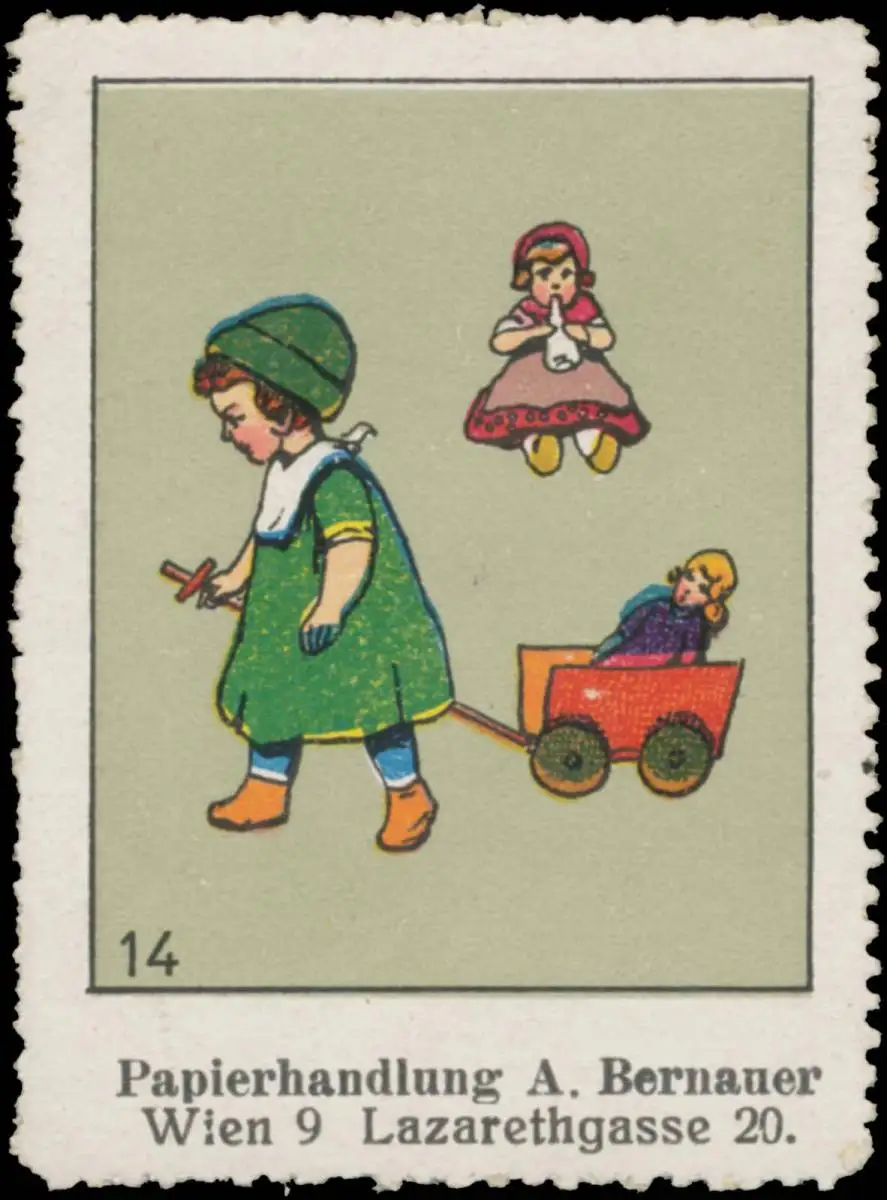 Kinder-Serie Bild 14, Papierhandlung A. Bernauer, Lazarethgasse 20, Wien, Größe/Zustand: 6x4 , guter Zustand, Original alte Reklamemarke die seinerzeit für die Werbung benutzt wurde