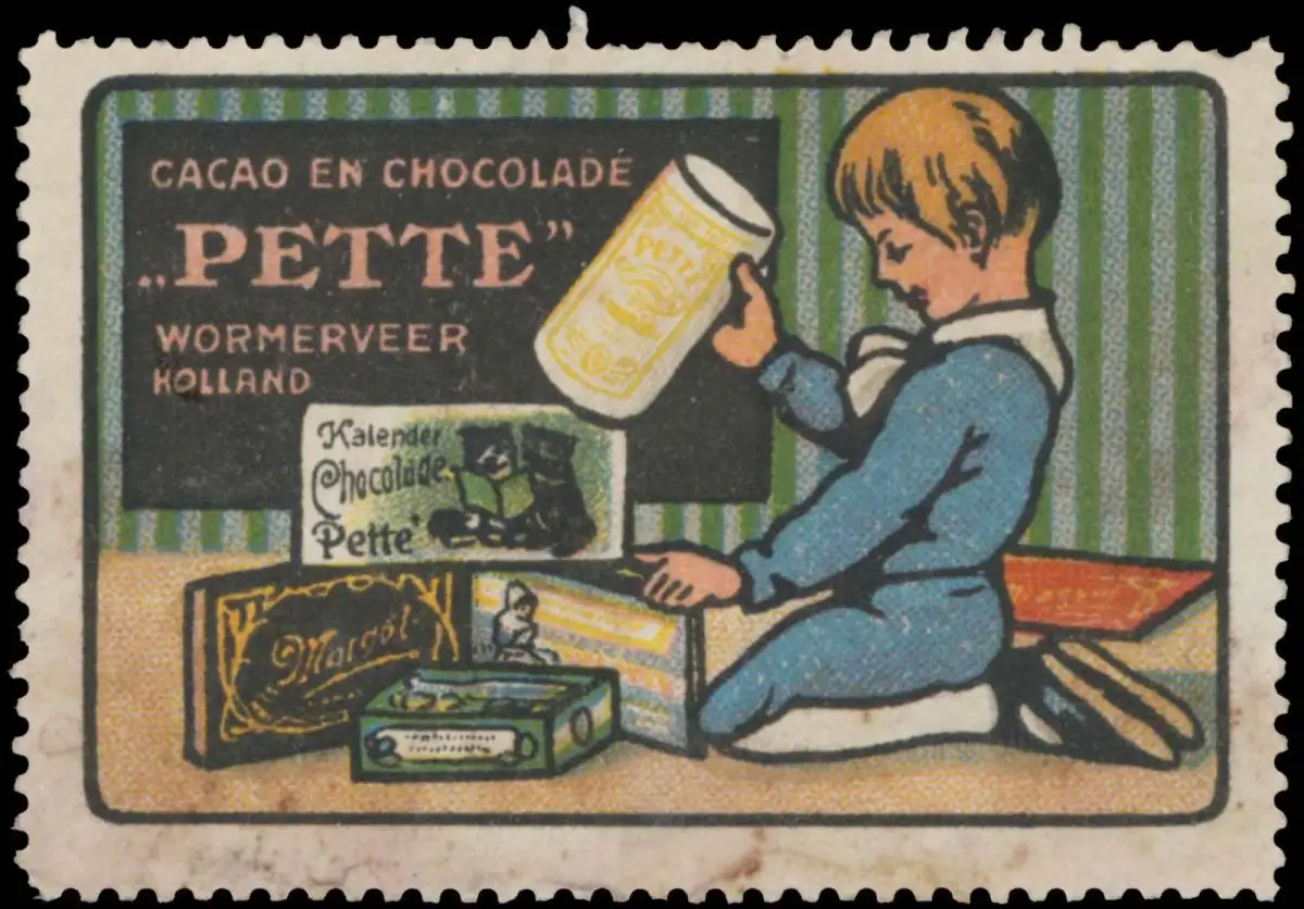 Cacao en Chocolade, Kako, Schokolade, Größe/Zustand: 4x6 , beschädigt, Original alte Reklamemarke die seinerzeit für die Werbung benutzt wurde