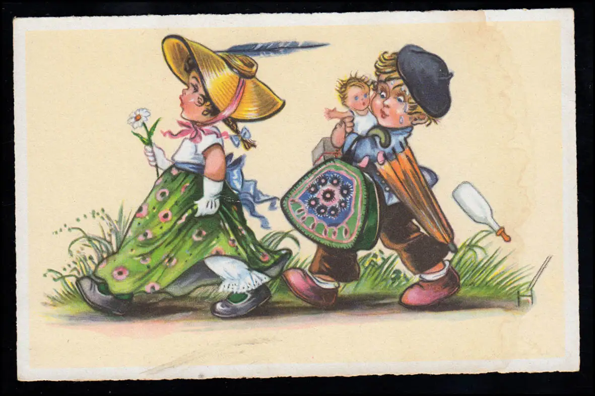 Kinder-AK Mädchen und Junge auf Wanderschaft mit Puppe und Gepäck, ungebraucht