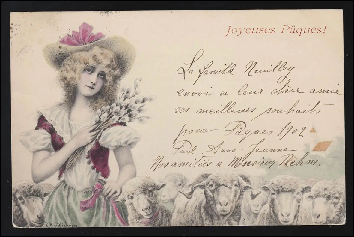 Kinder AK Schäferin Schafe Ostern Joyeuses Paques PARIS/ BIBERACH 30./31.3.02