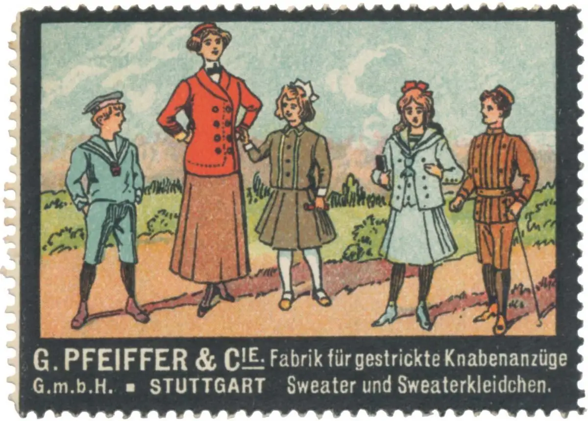 Fabrik für gestrickte Knabenanzüge, Sweater und Sweaterkleidchen, Größe/Zustand: 4x6 , guter Zustand, Original alte Reklamemarke die seinerzeit für die Werbung benutzt wurde