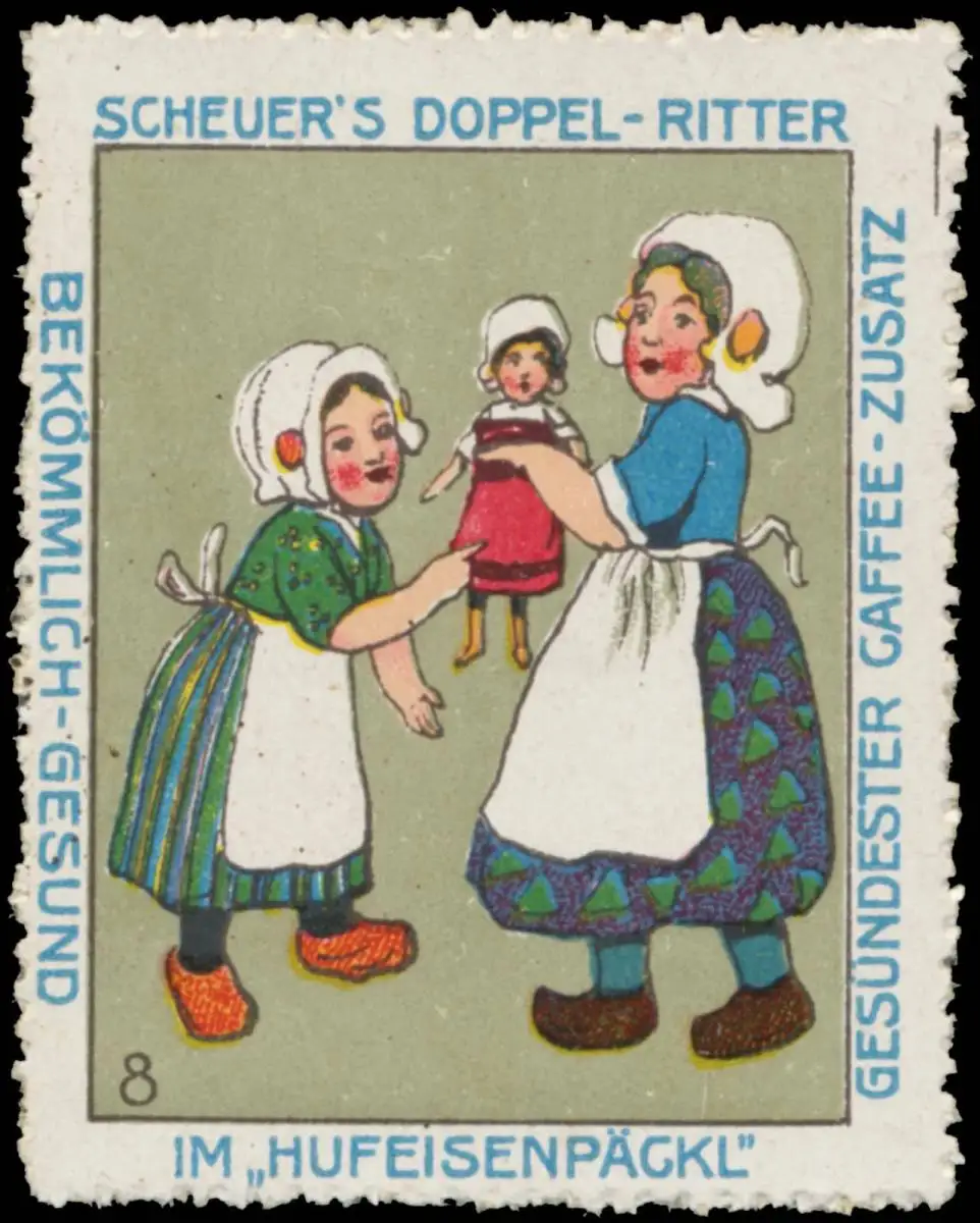 Scheuers Doppel-Ritter gesündester Kaffee-Zusatz im Hufeisenpägkl, Kinder-Serie Bild 8, Spielzeug, Größe/Zustand: 5x4 , guter Zustand, Original alte Reklamemarke die seinerzeit für die Werbung benutzt wurde