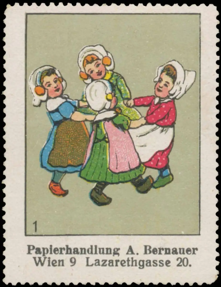 Kinder-Serie Bild 1, Papierhandlung A. Bernauer, Lazarethgasse 20, Wien, Größe/Zustand: 6x4 , guter Zustand, Original alte Reklamemarke die seinerzeit für die Werbung benutzt wurde