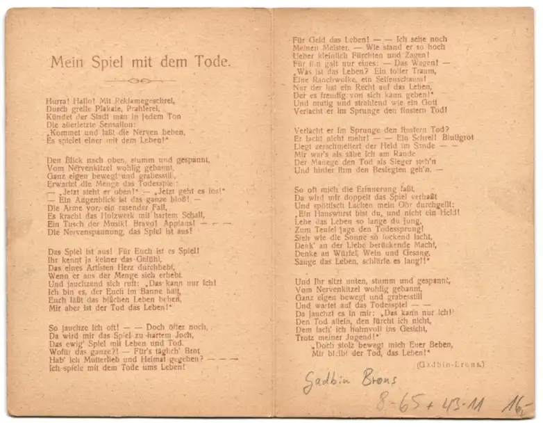 Klapp-AK Akrobat Gadbin Brons und sein Spiel mit dem Tode, Gedicht