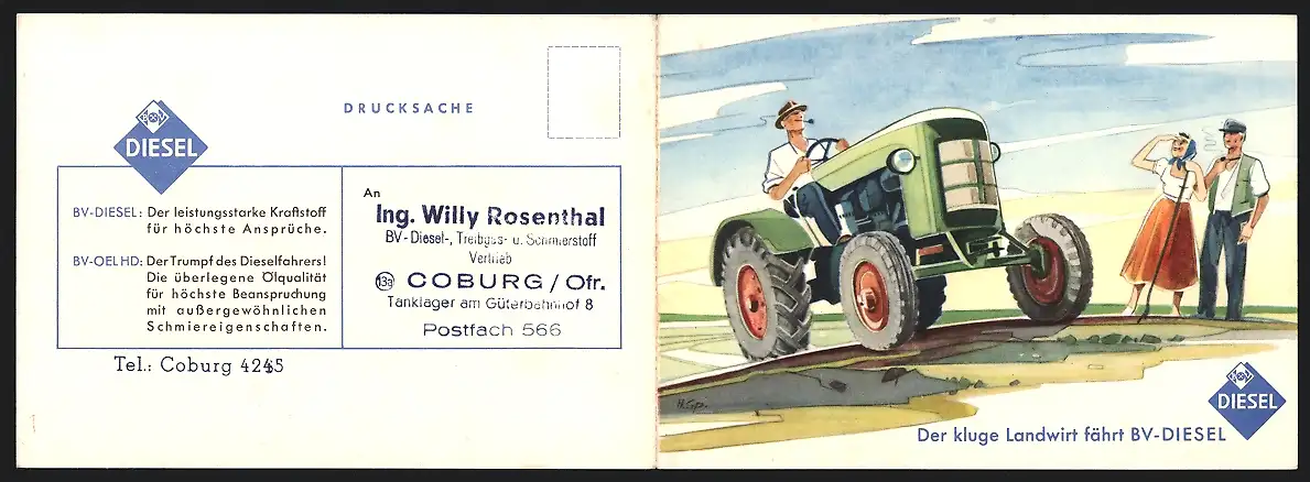 Klapp-AK Bauer auf seinem Traktor, Reklame für BV-Diesel