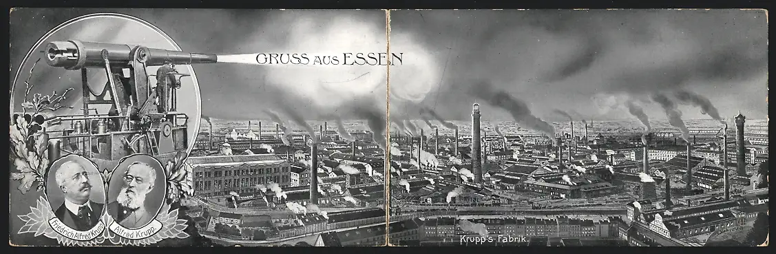 Klapp-AK Essen, Krupps Fabrik, Friedrich Alfred und Alfred Krupp, Kanone