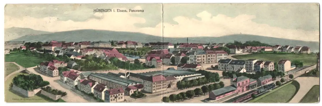 Klapp-AK Hüningen i. Elsass, Panorama mit Bahnhof