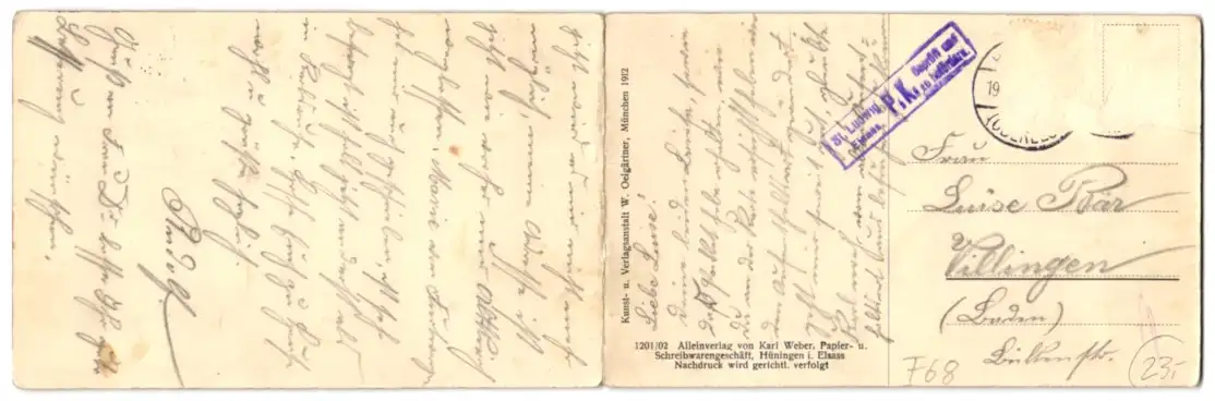 Personenbezogene Daten auf der Rückseite der Karte wurden durch blauen Textmarker unkenntlich gemacht. Die blauen Stellen sind auf die Vorderseite durchgeweicht und wirken sich negativ auf das Postkartenfoto aus