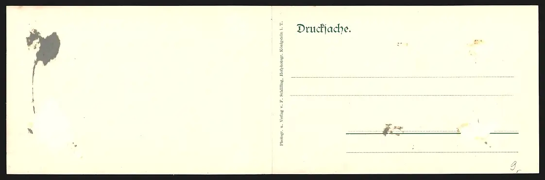 Personenbezogene Daten auf der Rückseite der Karte wurden durch blauen Textmarker unkenntlich gemacht. Die blauen Stellen sind auf die Vorderseite durchgeweicht und wirken sich negativ auf das Postkartenfoto aus