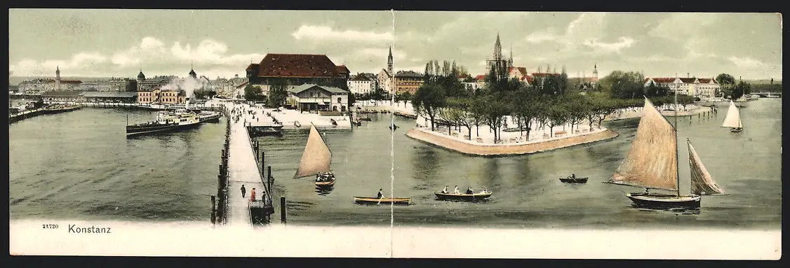 Klapp-AK Konstanz, Ortsansicht mit Dampfern und Segelschiffen