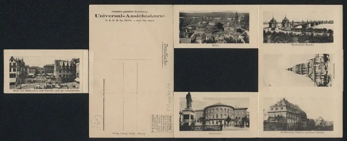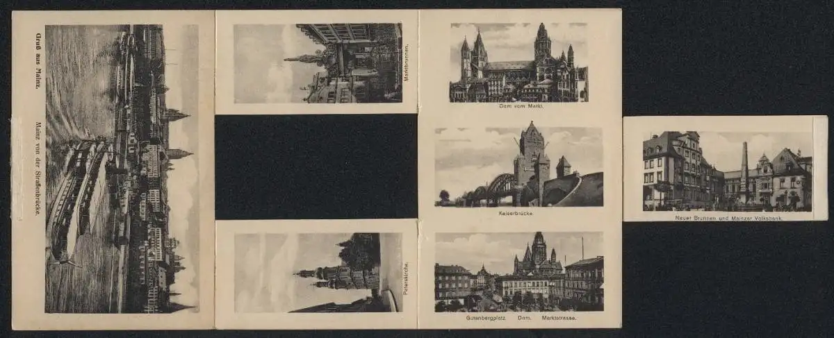 Klapp-AK Mainz, Ortsansicht mit Dampfer von der Strassenbrücke, Stadttheater, Christuskirche, Marktbrunnen, Peterskirche