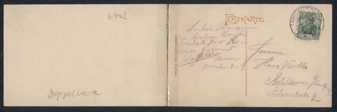 Personenbezogene Daten auf der Rückseite der Karte wurden durch blauen Textmarker unkenntlich gemacht. Die blauen Stellen sind auf die Vorderseite durchgeweicht und wirken sich negativ auf das Postkartenfoto aus
