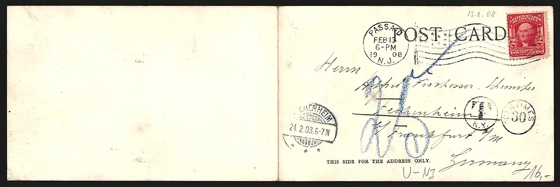 Personenbezogene Daten auf der Rückseite der Karte wurden durch blauen Textmarker unkenntlich gemacht. Die blauen Stellen sind auf die Vorderseite durchgeweicht und wirken sich negativ auf das Postkartenfoto aus