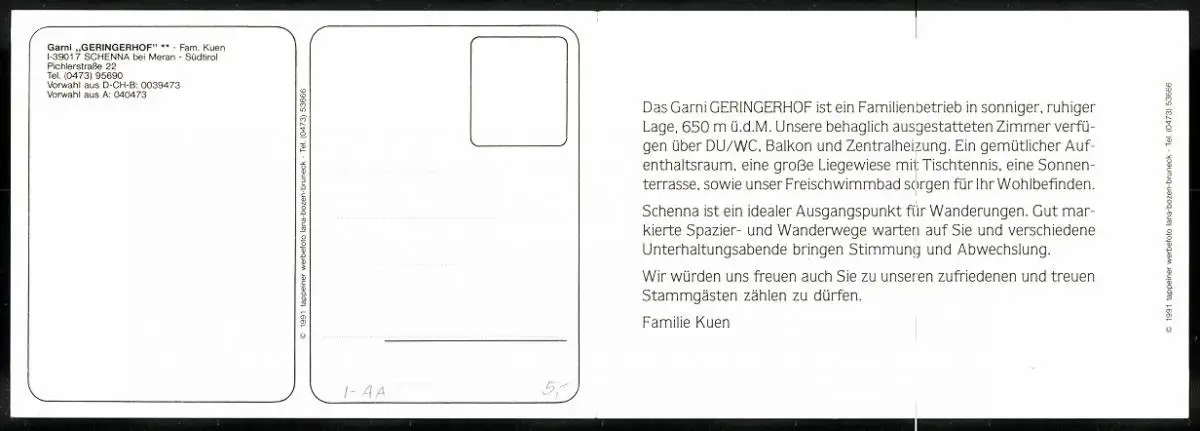 Klapp-AK Schenna bei Meran, Gasthaus Garni Geringerhof in der Pichlerstrasse 22