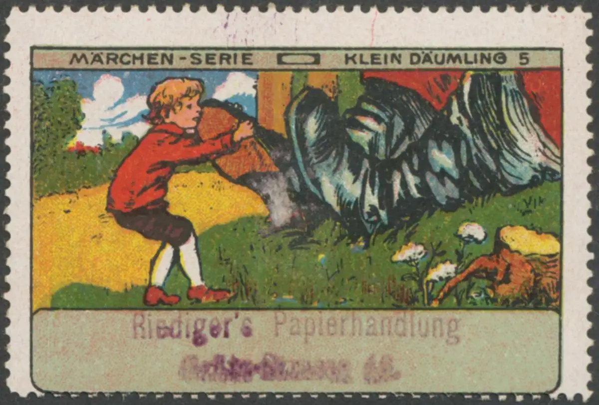 Märchen-Serie, Bild 5, Riediger, Grätz-Straße 46, Größe/Zustand: 4x6 , guter Zustand, Original alte Reklamemarke die seinerzeit für die Werbung benutzt wurde