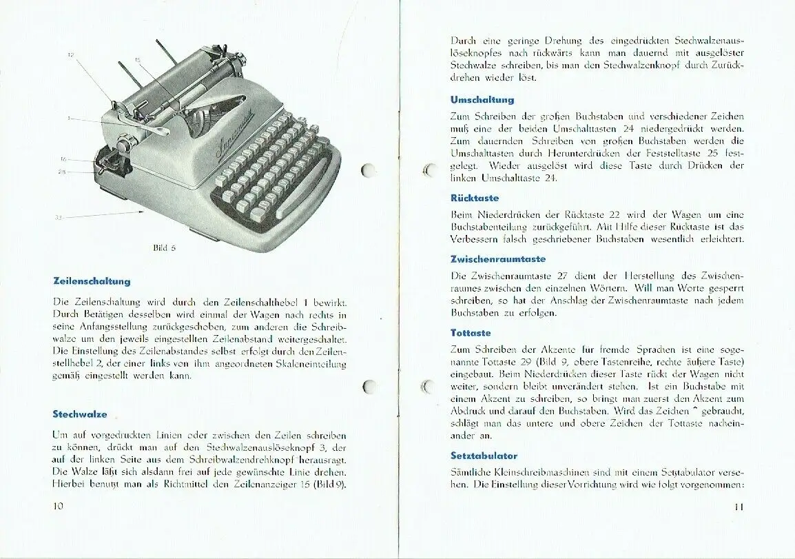 guter bis sehr guter Zustand, geringe Gebrauchs- und Alterungsspuren: sauber gelocht - Schriftprobe mit kleinen Randblessuren, Sie erhalten hier nur die original Anleitung, keine Maschine - Aufstellen der Schreibmaschine - Abnehmen der Haube - Auflegen des Farbbandes - Farbbandeinrichtung - Einführen des Papiers - Randeinstellung - Typenhebel-Entwirrung - Zeilenschaltung - Stechwalze - Umschaltung - Rücktaste - Zwischenraumtaste - Tottaste - Setztabulator - Tastenanschlagregler - Abnehmen des Wagens - Herausnehmen der Typenhebel - Praktische Ratschläge für Instandhaltung - Bezeichnung d. einzelnen Schreibmaschinenorgane - Beilage: Schriftprobe, Papier, ca. 15 x 20,5, 16 Seiten mit 9 Bildern + Beilage