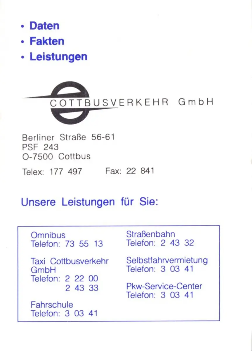 Kleines Faltblatt Daten - Fakten - Leistungen Cottbusverkehr GmbH Erscheinungsjahr: 08.1991 Herausgeber: Cottbusverkehr GmbH Format: 8 x 11,5cm, gefaltet Gewicht: 15g Inhalt: Chronologie der Geschichte der Cottbusverkehr GmbH Zahlen und Leistungen zur Cottbusverkehr GmbH Liniennetze Der