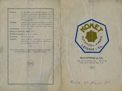 4 Seiten 22 x 14 cm Komet Automobil-Fabrik Buchmann & Co. Leisnig i. Sa. Keine Fahrzeugabbildung, nur Text Leichte Gebrauchsspuren