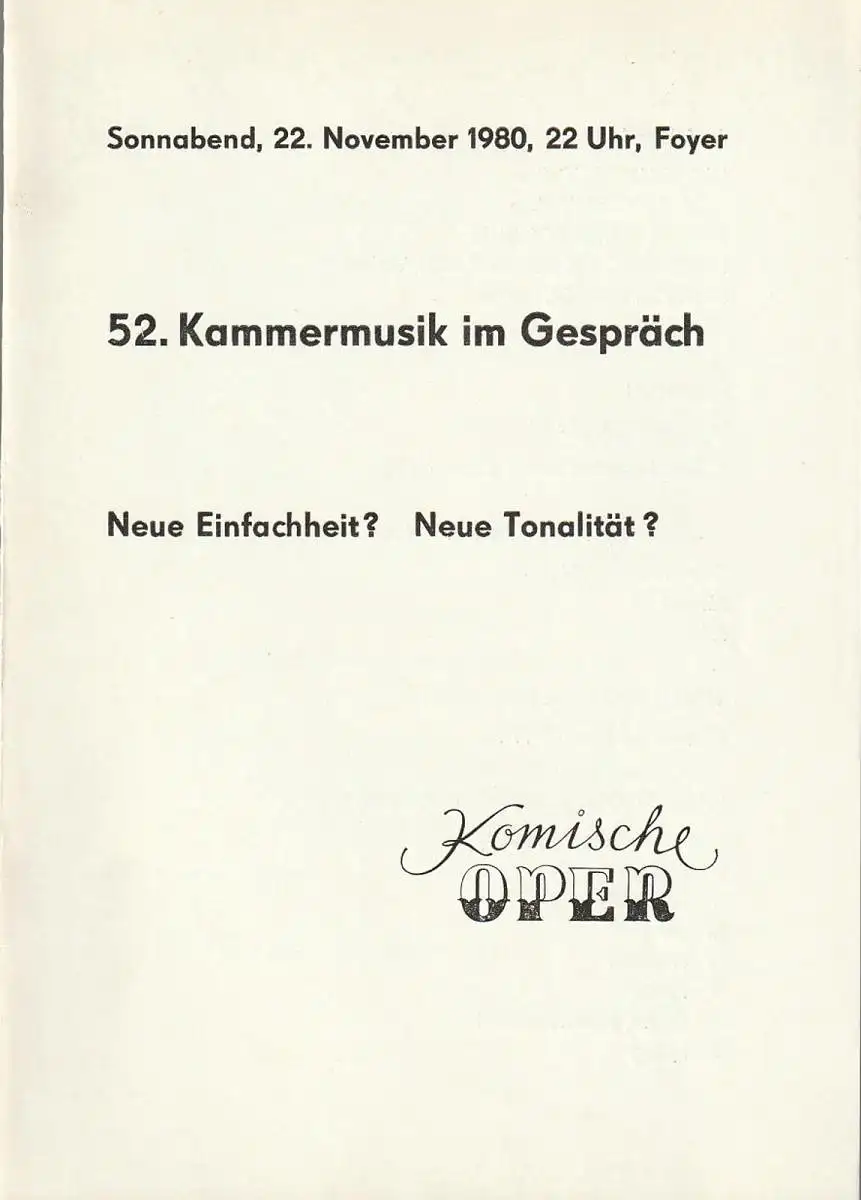 Komische Oper Berlin: Programmheft 52. KAMMERMUSIK IM GESPRÄCH 22. November 1980.