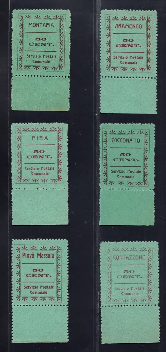 M - ohne Gummi - Kommunale Postdienste von Astigiano (Kat. Einheitliche Nr. 1/6) die komplette Serie der sechs Cent-Marken. 50 für die Gemeinden Aramengo, Cocconato, Cortazzone, Montafia, Piea und Piovà Massaia - Neu einwandfrei - Selten - Kat. euro 750 Cod. 2888/WEB