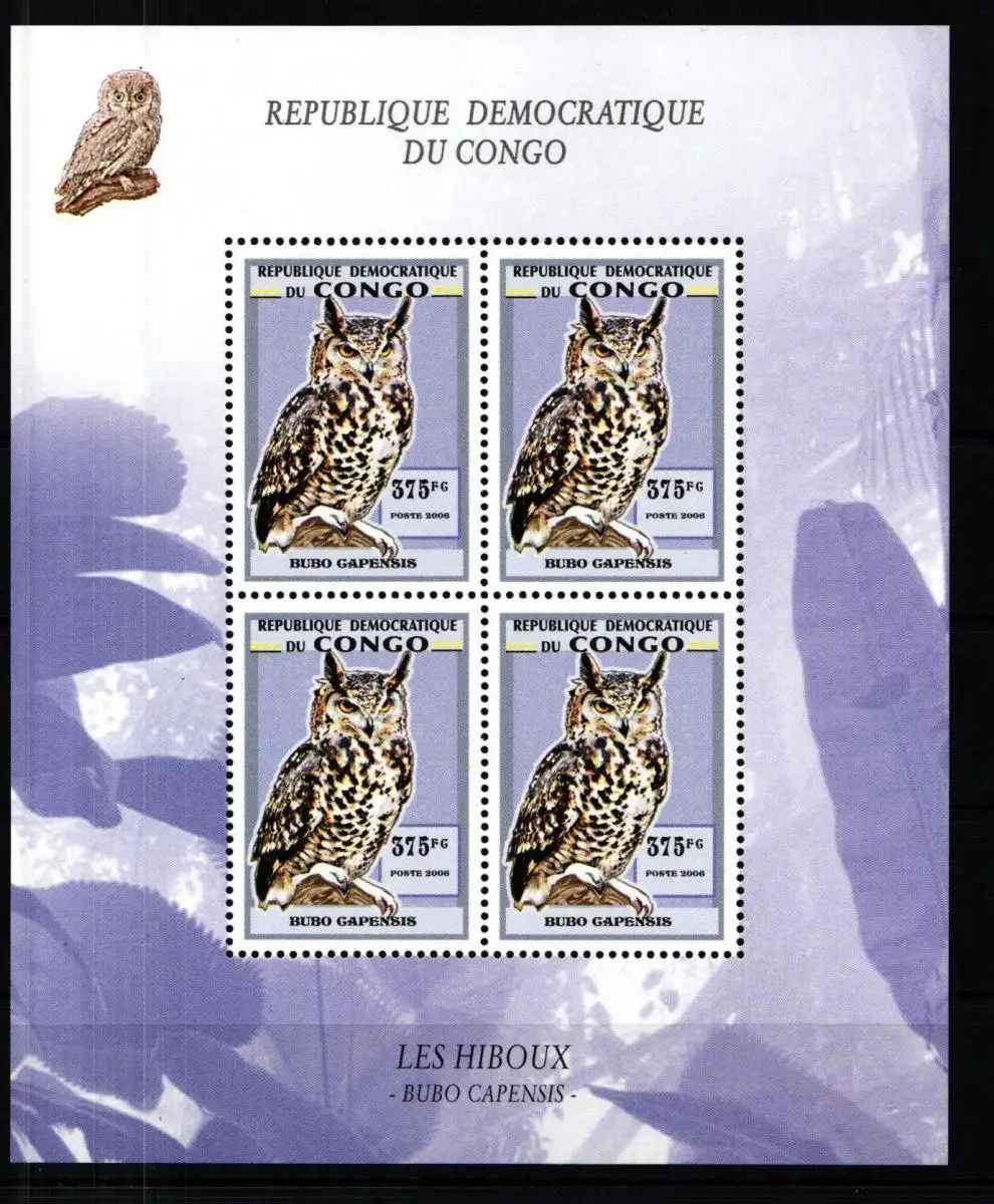 Kongo (Brazzaville) Eulen postfrisch als Kleinbogen, Eulen #KO880