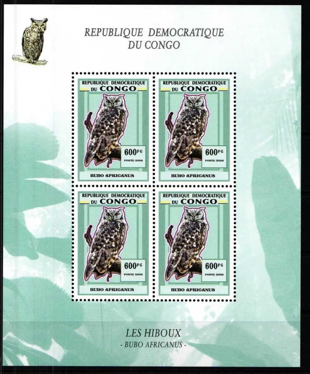Kongo (Brazzaville) Eulen postfrisch als Kleinbogen, Eulen #KO881