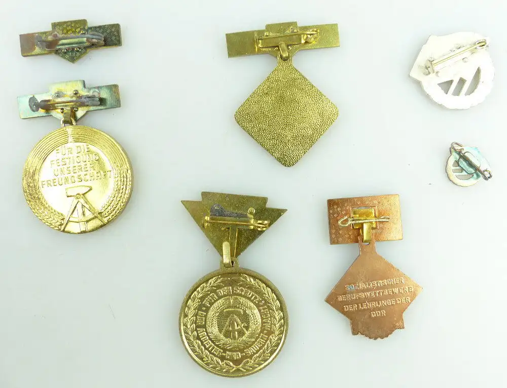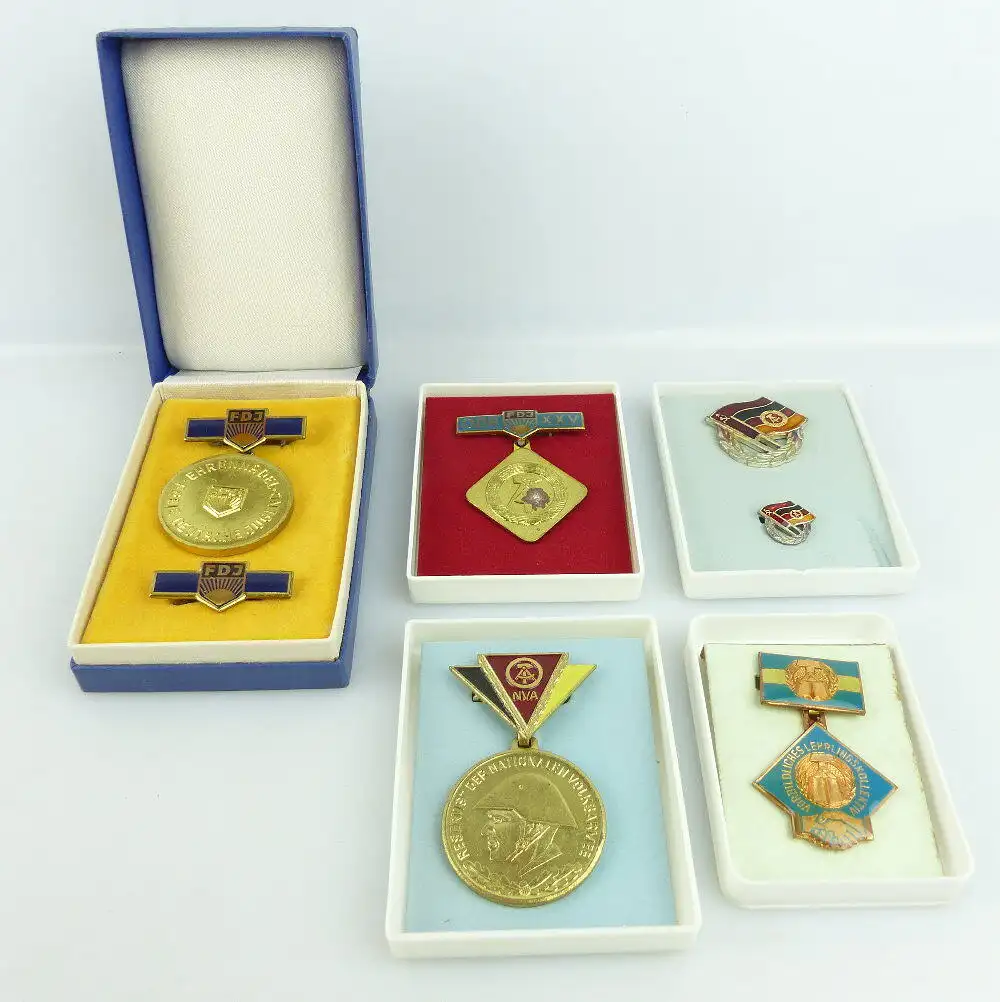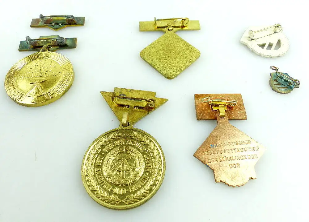 Sie sehen hier auf 5 original alte DDR Abzeichen im Etui :