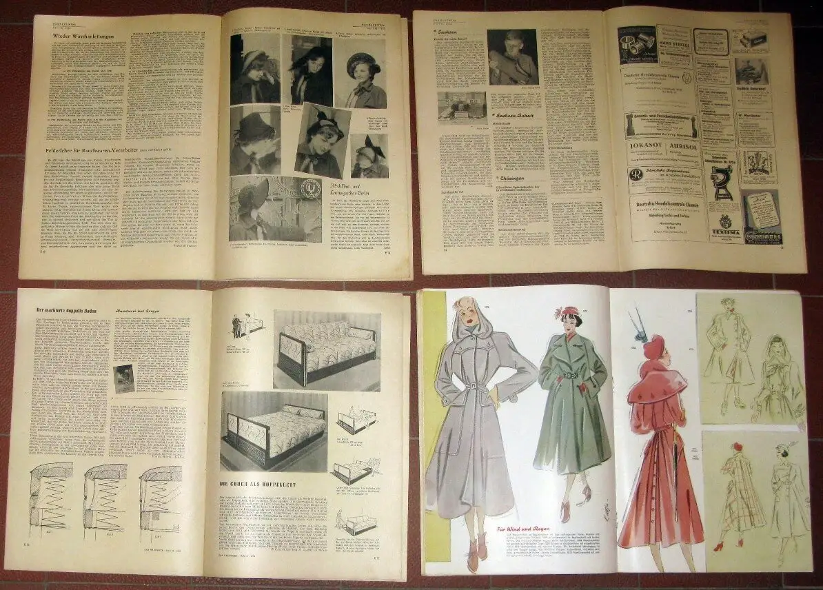 überwiegend guter Zustand, Gebrauchs- und Alterungsspuren: teils etwas knittrig, eselsohrig und mit kleinen Blessuren an Ecken und Kanten - einige Umschläge teils etwas beschabt und gering verschmutzt - Papier teils etwas vergilbt, aber Seiten überwiegend sauber und ordentlich - gelegentlich kleine Einrisse - Rückseiten mit Bleistiftnotizen an den Rändern - verschiedene kleine Blessuren - wenige Seiten an Rändern oder Ecken etwas wasserwellig und -fleckig, Sie erhalten folgende Hefte geliefert: - 1950: 10, 11, 12 - 1951: 2, 3, 5-12 - 1952: 1-12 (komplett) - Inhalt des allgemeinen Teils - Ein Jahr Deutsche Demokratische Republik - Gesetze - Steuern und Steuergesetze - Politik (DDR und Westdeutschland) - Hilfe für Umsiedler - Spart Energie und Rohstoffe - Aus den Ländern der Deutschen Demokratischen Republik - Berufswettbewerb der deutschen Jugend - Fünfjahrplan und Handwerk - Egoistische Geschäftemacher in den Genossenschaften - Deutsch-Sowjetische Freundschaft - Helft dem tapferen koreanischen Volk - Zur Lehrlingsentlohnung - Leipziger Messe - Wahlordnung für die Landeshandwerkskammern - Gesetze für die Frauen im Handwerk - Konkurse und Vergleichsverfahren in Niedersachsen 1950 - Die badische Wirtschaft am Abgrund - Kulturhaus des Dresdner Handwerks - Handwerk hilft bei der Vorbereitung der III. Weltfestspiele der Jugend und Studenten - Die erste Dachdeckermeisterin in der DDR - "Deutsche" Handwerksmesse - Gesetze müssen von allen befolgt werden - Meisterlehre und Berufsschule - Schuhe aus Stahl? - Gegen die Schwarzarbeit - Wichtiges zur Sozialversicherung - Westdeutsche Steuerpolitik - Eine Meisterin des Ofenbaues - Handwerksproduktion auf 166,5 % erhöht - 34 Handwerker verlieren Heim und Existenz (neuer amerikanischer Panzerübungsplatz bei Hohenfels in Bayern) - u. v. a. m. - Fachteil für das Leder- sowie Textil- und Bekleidungshandwerk (1950) - Der Frack - ein individuelles Kleidungsstück - Das handgemalte Kleid - Fehlerlehre für Rauchwaren-Verarbeiter - Die Reparatur von California-Böden - Dreiviertel-Couch mit Bettkasten - Englische Kante und doppelter Federboden - Kuhanspannung mit Dreipolsterkumt - Fehlerhafte Rundstuhl-Futterware - Der Damenstiefel - Die Vorderkappe bei Skistiefeln - Orthopädische Holzschuhe und Pantoffelsohlen - Vierfarbige Modebeilage - Die Couch als Doppelbett - Gummisoehen kleben oder nageln? - Halbschuh mit Blattverzierung - Der unrunde Fussball - Überflüssige Schirmmacher? - Lampenschirme - Die Hose - Leistungsschau in Mecklenburg - Maschinen für den Stricker - Plissee weiterhin bevorzugt - Grotzengabelung nach oben und unten - Modefavorit: Ozelot-Katze - Preise für Textilwaren - Mischgarne aus Perlon und Zellwolle - Kleidergrundschnitt - Sportmantel - Das Strohhut-Geschäft - Der modekranke Sakko - Der Zuschnitt von Plisees - Kammgarncharakter - Stickerei-Muster - Bluse und Rock einmal anders - Die Weste - Der unharmonisch wirkende Mantel - Verarbeitung von Perlon - Gestaltung der Schaufenster - Herrenmode 1952 - Schmuckfedern - Bügeln von zellwollhaltigen Mischgeweben - Stoff für Ski-Bekleidung - Baummarder und Steinmarder - u. v. a. m, Softcover, ca. 21 x 29,5, je 16 Seiten (ab Heft 1/52 je 32) mit zahlreichen Bildern und 6 Beilagen