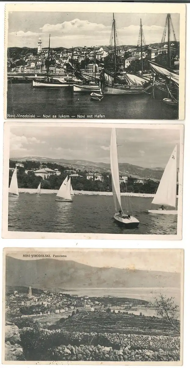 Bemerkungen: Konvolut von 3 Photokarten mit Ansichten von Novi Vinodolski (Novi del Vinodol). Gelaufen mit Briefmarken und Stempel.