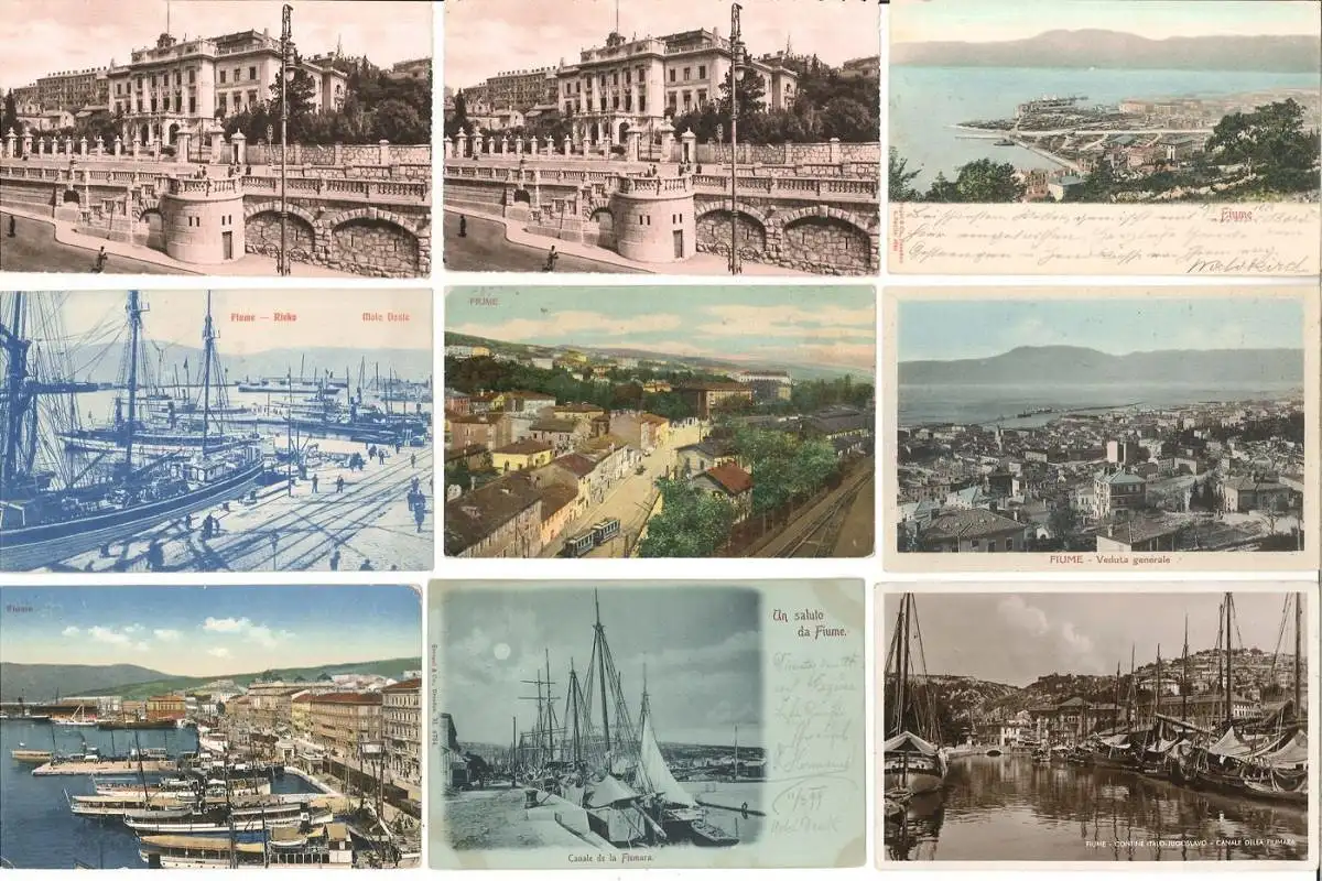 Bemerkungen: Konvolut von 36, teils farbigen, Postkarten u. Photokarten mit Ansichten von Rijeka (Fiume). Wenige Doubletten. Zumeist gelaufen mit Briefmarken und Stempel.