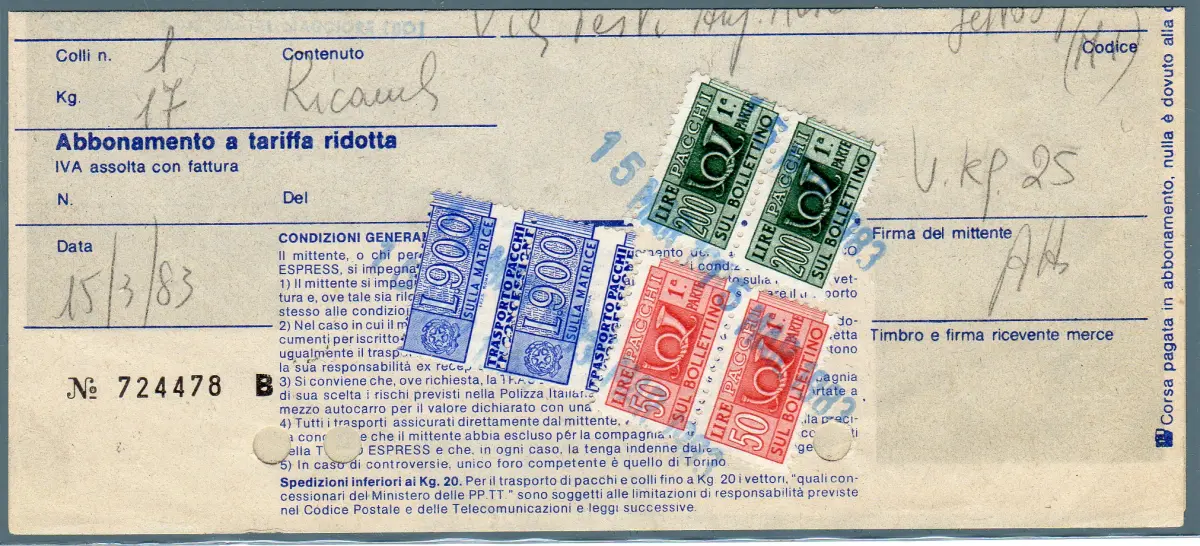 Konzessionspakete Lire 900 Sorten auf Vollgummi-Bulletin - Konzessionspakete Lire 900 - Versandschein frankiert zwei Exemplare (rechte Abschnitte) mit stark senkrecht verschobener Verzahnung (siehe Kat. Sass. spec. Nr. 41 Ea) - Ann. Stempeldatum 15.3.83 - Uncommon Cod. 906/13