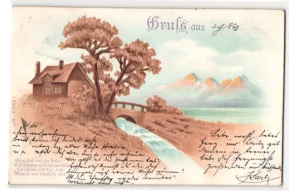 Kork-AK Einsames Haus an einem Bach