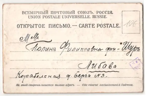 Personenbezogene Daten auf der Rückseite der Karte wurden durch blauen Textmarker unkenntlich gemacht. Die blauen Stellen sind auf die Vorderseite durchgeweicht und wirken sich negativ auf das Postkartenfoto aus