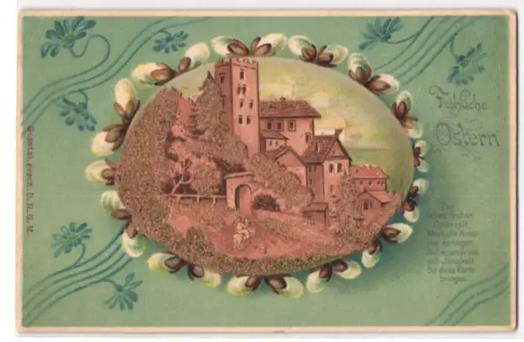 Kork-AK Ostergruss, Reiter vorm Stadttor