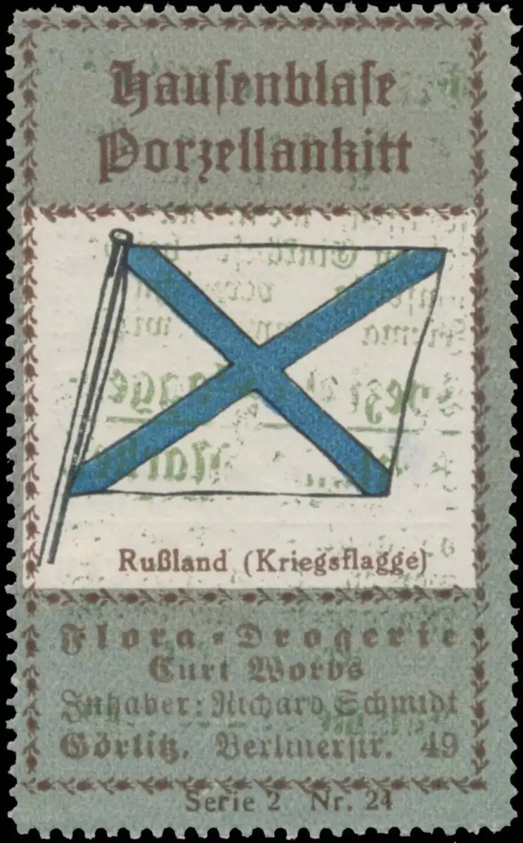 Porzellankitt, Serie 2, Nr. 24, Flora-Drogerie, Curt Worbs, Inhaber: Richard Schmidt, Berliner Straße 49, Größe/Zustand: 6x4 , Fehldruck, guter Zustand, Original alte Reklamemarke die seinerzeit für die Werbung benutzt wurde