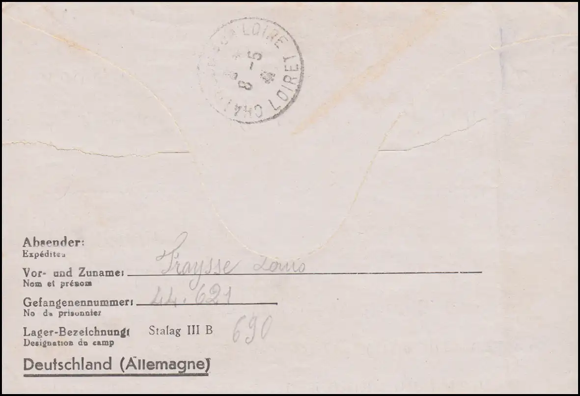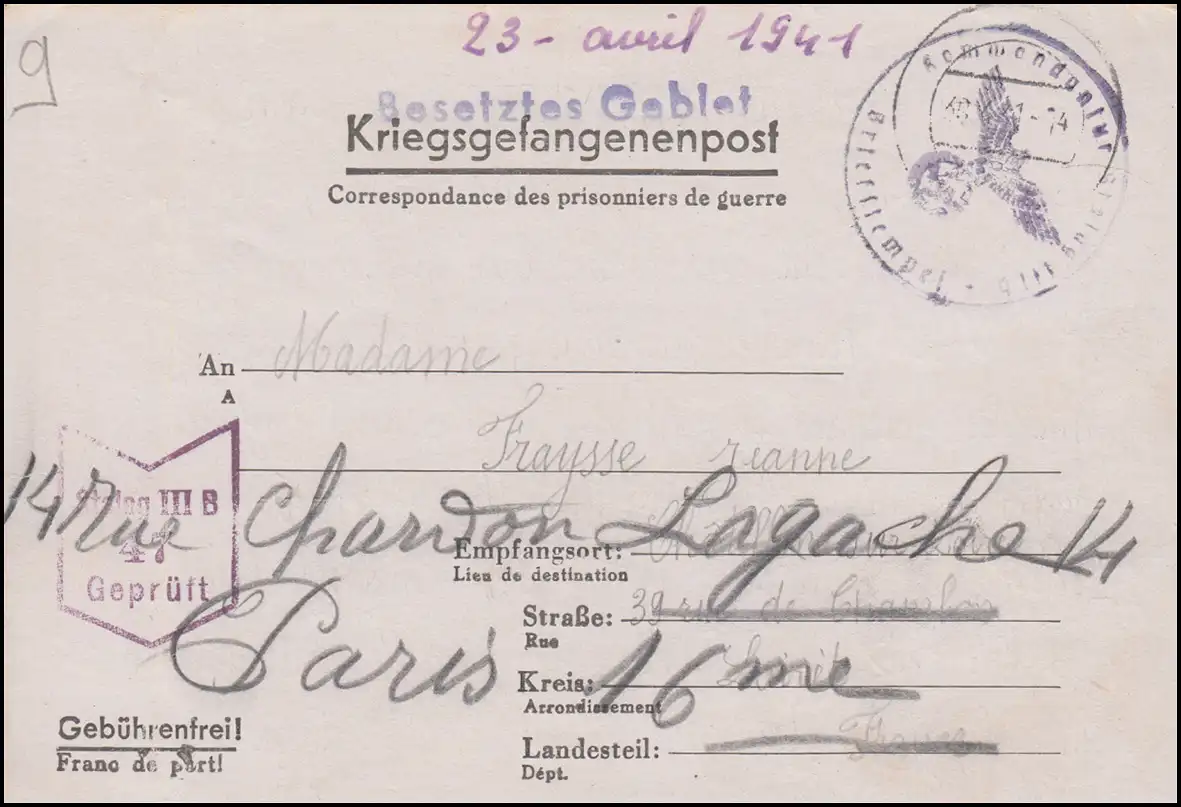Kriegsgefangenenpost Stalag III B, nach Frankreich 8.6.1941