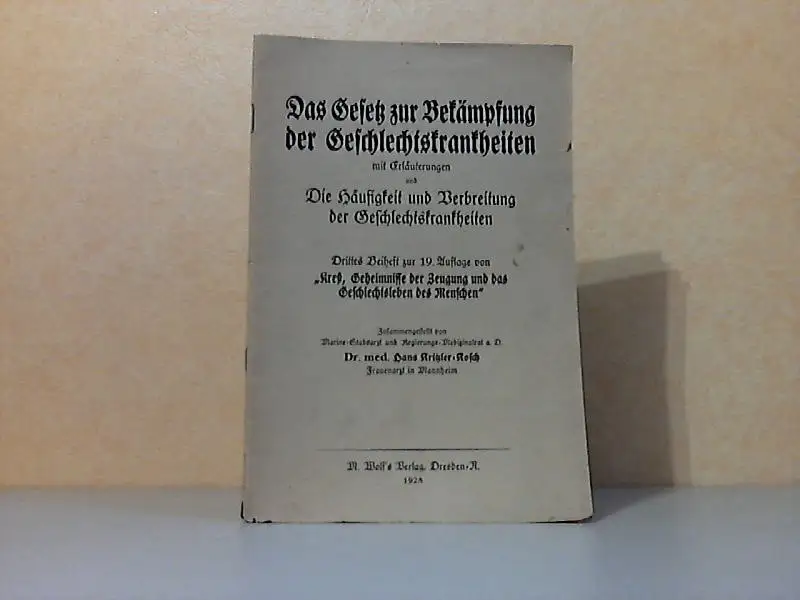 Das Gesetz zur Bekämpfung der Geschlechtskrankheiten; drittes Beiheft zur 19. Auflage von "Kreß, Geheimnisse der Zeugung und das Geschlechtsleben des Menschen"; Medizin; Krankheit; Hans Kritzler-Rosch