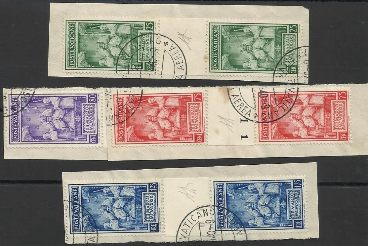 Krönung SS. Pius XII. Paare mit Blattabstand - Krönung SS. Pius XII Nr. 68/71 Serie in vertikalen Paaren, die in der Mitte durch Blattzwischenräume getrennt sind (Gutter Pairs); verwendet auf AD-signierten Fragmenten Code 707/7