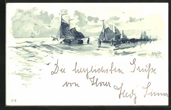 Künstler-AK A. Heide: Segelschiffe am Ufer