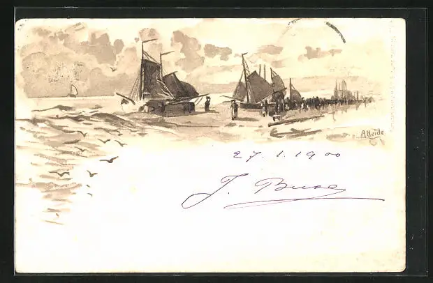 Künstler-AK A. Heide: Uferpartie mit Segelbooten