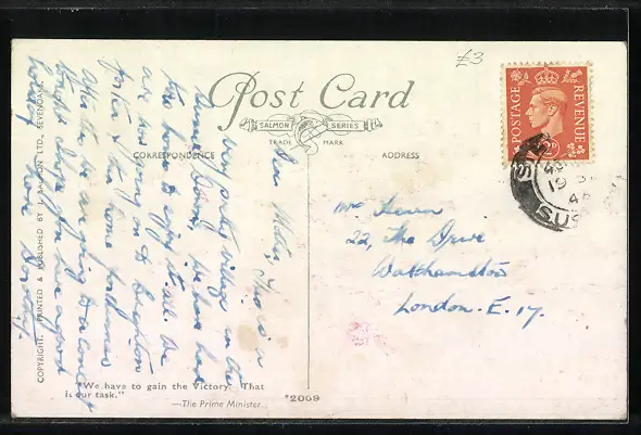 Personenbezogene Daten auf der Rückseite der Karte wurden durch blauen Textmarker unkenntlich gemacht. Die blauen Stellen sind auf die Vorderseite durchgeweicht und wirken sich negativ auf das Postkartenfoto aus