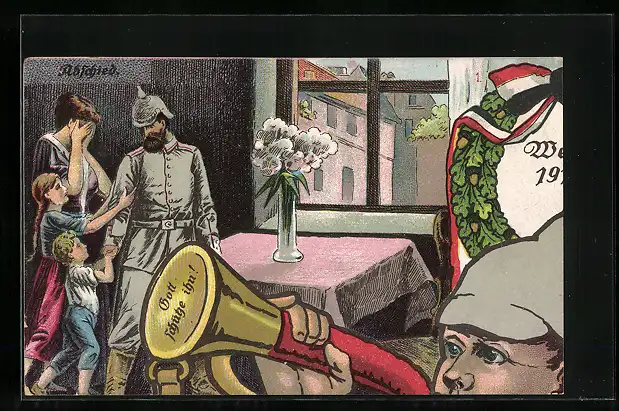 Künstler-AK Abschied, Soldat in Uniform verabschiedet Frau und Kinder, Soldatenliebe