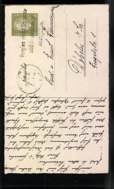 Personenbezogene Daten auf der Rückseite der Karte wurden durch blauen Textmarker unkenntlich gemacht. Die blauen Stellen sind auf die Vorderseite durchgeweicht und wirken sich negativ auf das Postkartenfoto aus