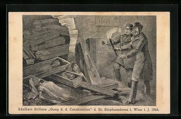 Künstler-AK Adalbert Stifters Gang d. d. Catakomben d. St. Stephansdom in Wien 1844