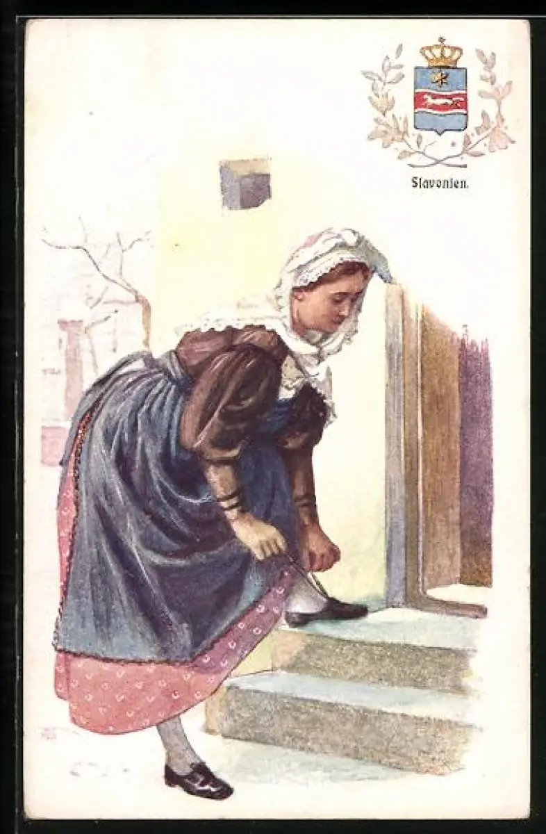 Künstler-AK Adolf Karpellus: Slawonien, Dame bindet ihrern Schuh