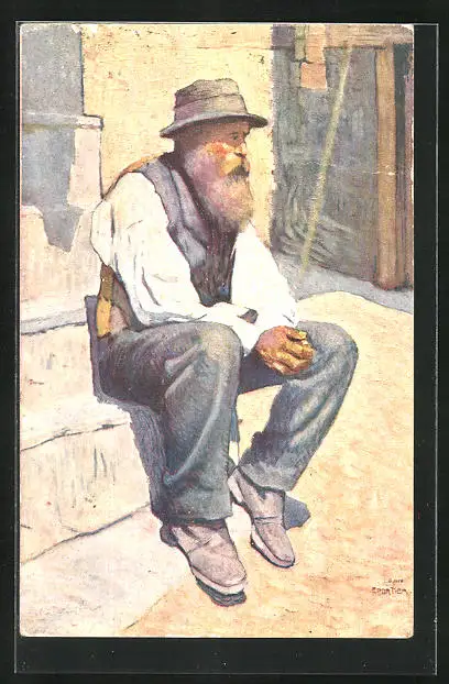 Künstler-AK Älterer Mann sitzt auf Treppenstufen, Pro Juventute