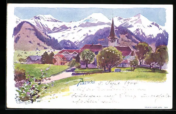 Künstler-AK Aeschi, Ortsansicht mit verschneitem Gebirgspanorama